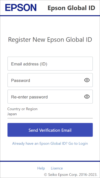 On the "Register New Epson Global ID" screen, enter an email address and password, select your country or region, and then click (tap) Send Verification Email.